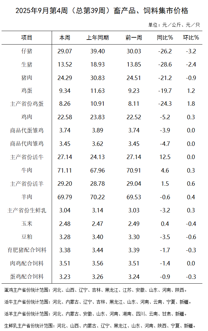 据对全国500个县集贸市场和采集点的监测,9月第4周(采集日为9月25日)鸡蛋、鸡肉、牛肉、肉羊、生鲜乳价格环比上涨,生猪产品、玉米、豆粕、育肥猪配合饲料、蛋鸡配合饲料价格环比下跌,商品代雏鸡、活牛、肉鸡配合饲料价格环比持平。