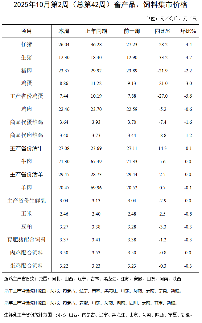 据对全国500个县集贸市场和采集点的监测,10月第2周(采集日为10月16日)生猪产品、鸡蛋、鸡肉、商品代雏鸡、活牛、羊肉、玉米、豆粕、育肥猪配合饲料、蛋鸡配合饲料价格环比下跌,牛肉、活羊、生鲜乳、肉鸡配合饲料价格环比持平。
