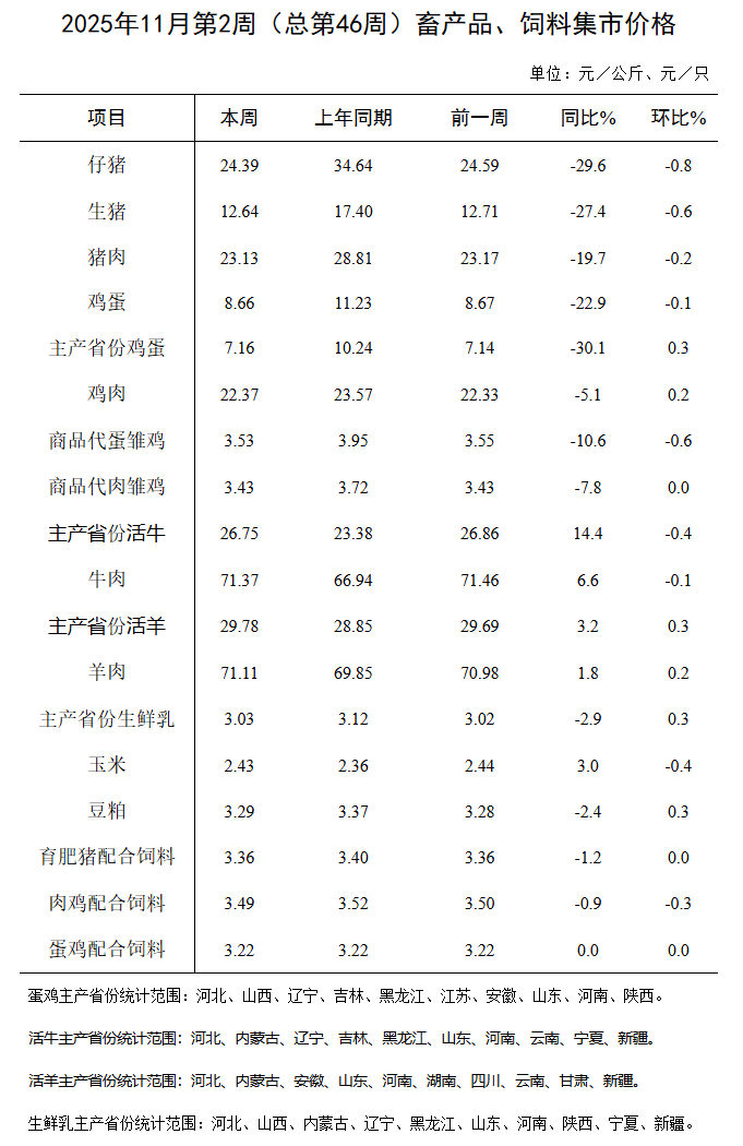 据对全国500个县集贸市场和采集点的监测,11月第2周(采集日为11月13日)鸡蛋、鸡肉、肉羊、生鲜乳、豆粕价格环比上涨,生猪产品、商品代蛋雏鸡、肉牛、玉米、肉鸡配合饲料价格环比下跌,商品代肉雏鸡、育肥猪配合饲料、蛋鸡配合饲料价格环比持平。