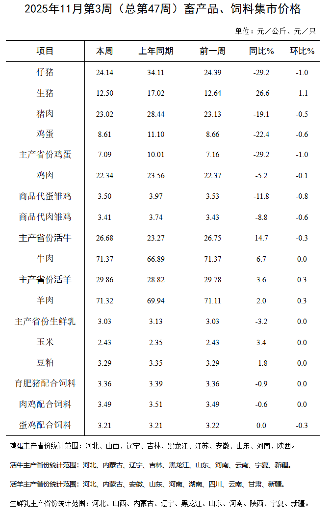 据对全国500个县集贸市场和采集点的监测,11月第3周(采集日为11月20日)肉羊价格环比上涨,生猪产品、鸡蛋、鸡肉、商品代雏鸡、活牛、蛋鸡配合饲料价格环比下跌,牛肉、生鲜乳、玉米、豆粕、育肥猪配合饲料、肉鸡配合饲料价格环比持平。