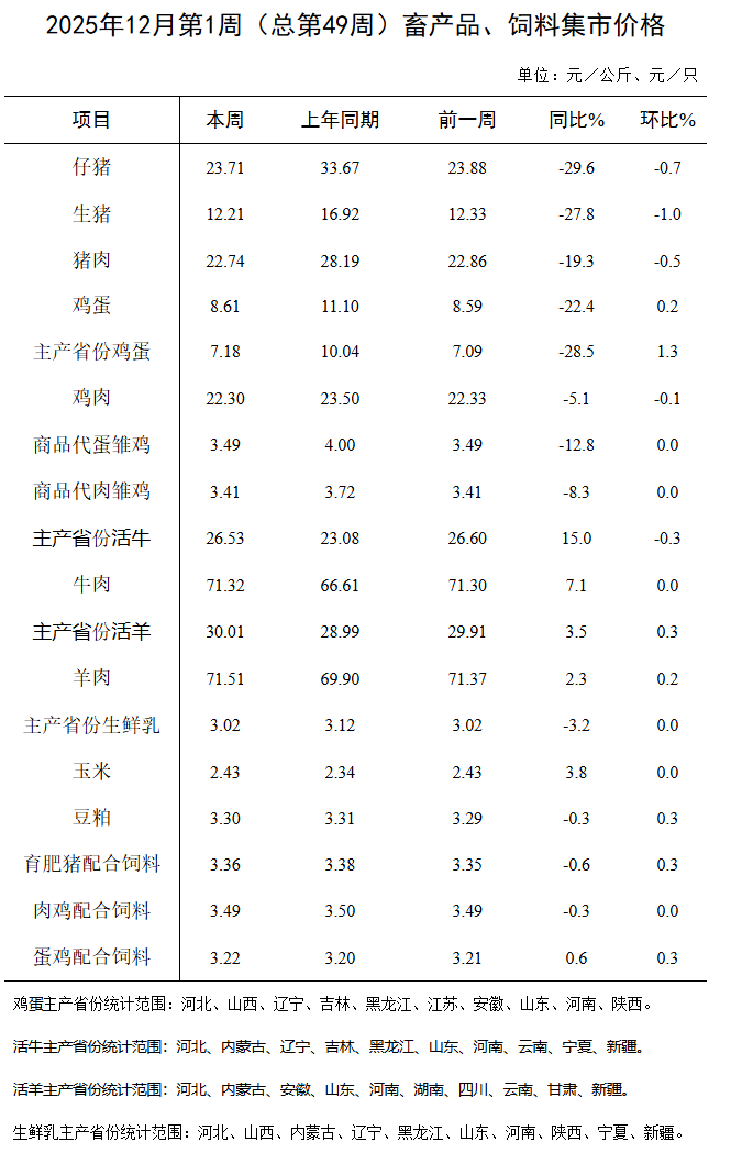 据对全国500个县集贸市场和采集点的监测,12月第1周(采集日为12月4日)鸡蛋、肉羊、豆粕、育肥猪配合饲料、蛋鸡配合饲料价格环比上涨,生猪产品、鸡肉、活牛价格环比下跌,商品代雏鸡、牛肉、生鲜乳、玉米、肉鸡配合饲料价格环比持平。
