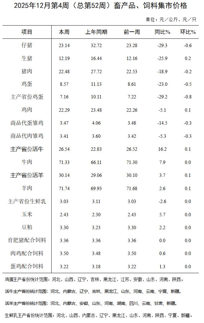 据对全国500个县集贸市场和采集点的监测,12月第4周(采集日为12月25日)生猪、鸡肉、活牛、肉羊价格环比上涨,仔猪、猪肉、鸡蛋、商品代雏鸡价格环比下跌,牛肉、生鲜乳、饲料产品价格环比持平。