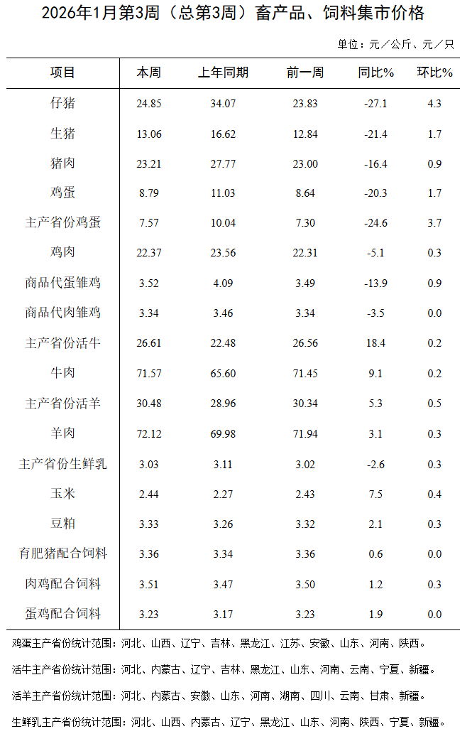 据对全国500个县集贸市场和采集点的监测,1月第3周(采集日为1月15日)生猪产品、鸡蛋、鸡肉、商品代蛋雏鸡、肉牛、肉羊、生鲜乳、玉米、豆粕、肉鸡配合饲料价格环比上涨,商品代肉雏鸡、育肥猪配合饲料、蛋鸡配合饲料价格环比持平。