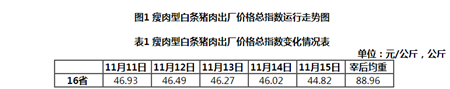 据农业农村部信息中心和山东卓创资讯股份有限公司联合监测,2019年第46周(即11月11日-11月15日,以下简称本周),16省(直辖市)瘦肉型白条猪肉出厂价格总指数的周平均值为每公斤46.11元,环比跌9.6%,同比大幅上涨156.5%。