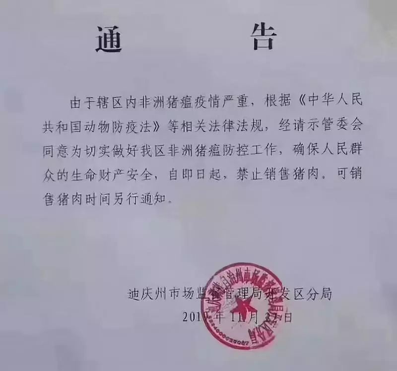 我们今天收到一张猪友发来的图片,细看内容这份“官方通告”真是让人啼笑皆非。通告大意是,由于迪庆州内非洲猪瘟疫情严重,为了确保人民群众的生命财产安全,自即日(2019年11月22日)起,禁止销售猪肉……恢复销售时间不定……