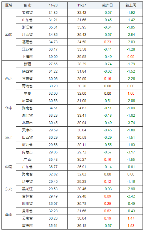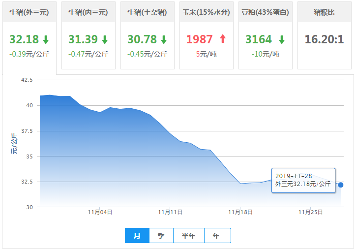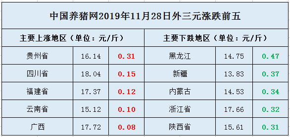 2019年11月28日,据中国养猪网猪价系统监测全国外三元均价为16.09元/斤,猪价较昨日下跌了0.20元/斤,较上周下跌了0.24元/斤。涨幅在0.05-0.31元/斤,跌幅在0.06-0.47元/斤之间。