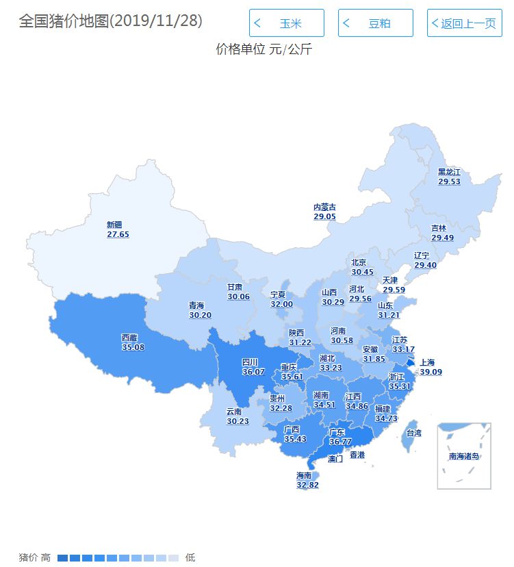 今日最高猪价:上海,价格为19.55元/斤;今日最低猪价:新疆,价格为13.83元/斤。