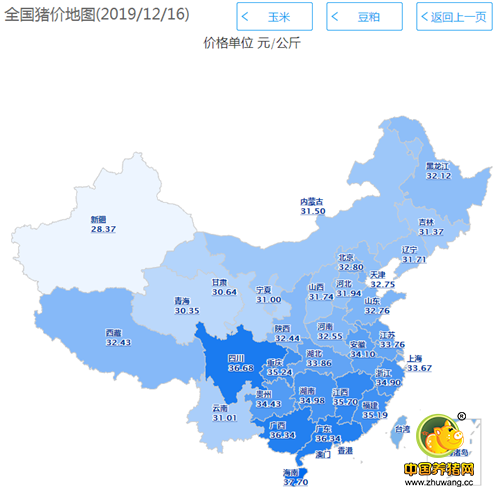 2019年12月16日,据中国养猪网猪价系统监测全国外三元均价为33.44元/公斤,猪价较昨日上涨了0.23元/公斤,较上周下跌了1.24元/斤。涨幅在0.05-0.87元/公斤,跌幅在0.05-0.48元/斤之间。