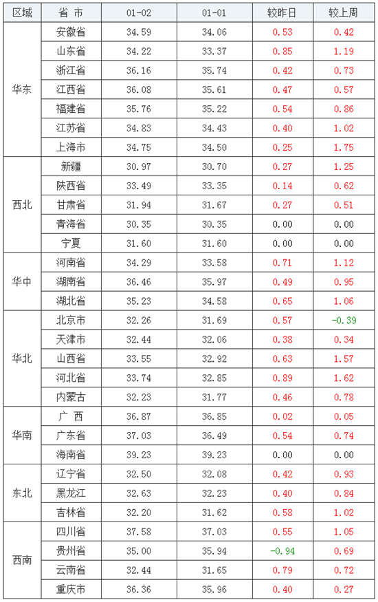 2020年1月2日,据中国养猪网猪价系统监测全国外三元均价为34.74元/公斤,猪价较昨日上涨了0.72元/公斤,较上周上涨了1.02元/斤。涨幅在0.02-0.89元/公斤,跌幅在0.01-0.94元/斤之间。