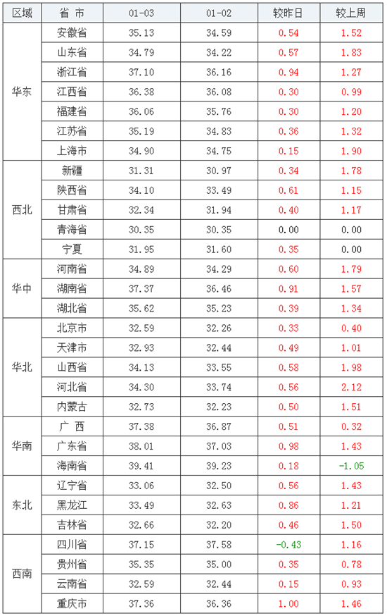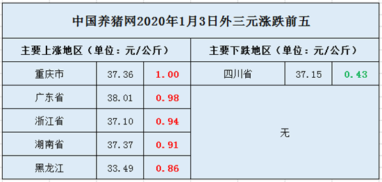 2020年1月3日,据中国养猪网猪价系统监测全国外三元均价为35.42元/公斤,猪价较昨日上涨了0.68元/公斤,较上周上涨了1.62元/斤。涨幅在0.15-1.00元/公斤,跌幅在0.01-0.43元/斤之间。