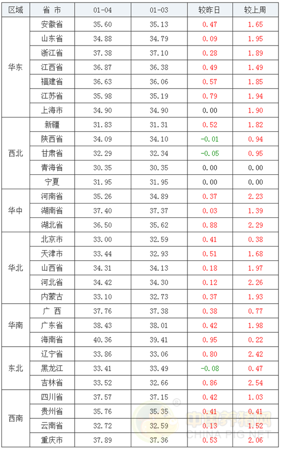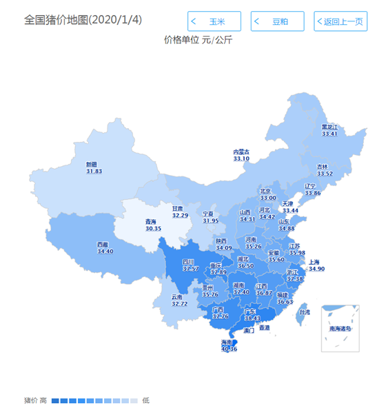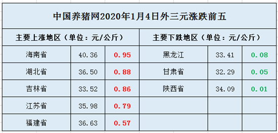 2020年1月4日,据中国养猪网猪价系统监测全国外三元均价为35.58元/公斤,猪价较昨日上涨了0.16元/公斤,较上周上涨了1.77元/斤。涨幅在0.03-0.95元/公斤,跌幅在0.01-0.08元/斤之间。