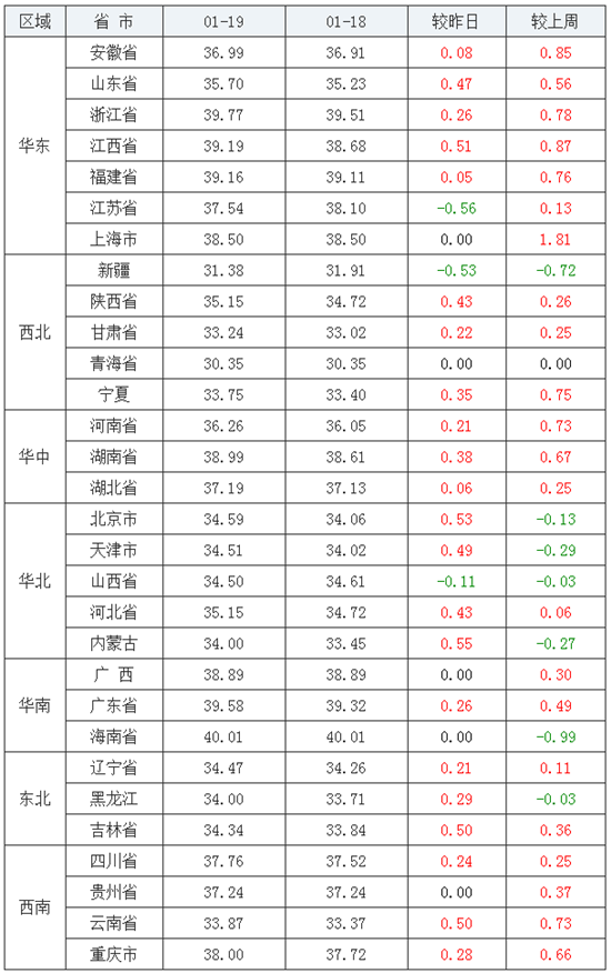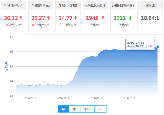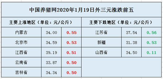 2020年1月19日,据中国养猪网猪价系统监测全国外三元均价为36.32元/公斤,猪价较昨日上涨0.08元/公斤,较上周下跌0.19元/公斤。涨幅在0.05-0.55元/公斤,跌幅在0.11-0.51元/斤之间。
