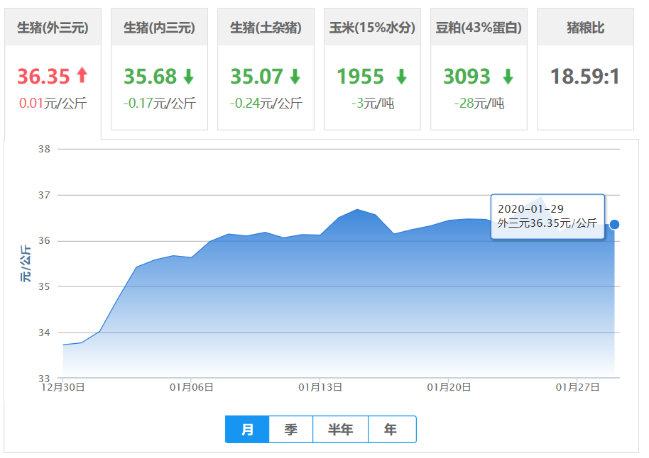 2020年1月29日,今日生猪(外三元)均价为36.35元/公斤,较昨日上涨0.01元/公斤,较上周上涨0.02元/公斤,较上月上涨2.69元/公斤,较去年上涨24.67元/公斤。