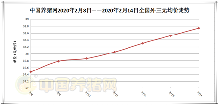 2020年2月14日,据中国养猪网猪价系统监测全国外三元均价为38.74元/公斤,价格较昨日上涨了0.22元/公斤。上周全国外三元均价为37.55元/公斤,今日较上周上涨了1.19元/公斤。内三元均价为37.32元/公斤,较昨日上涨了0.43元/公斤。土杂猪均价为36.81元/公斤,较昨天上涨了0.50元/公斤。