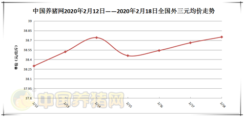 2020年2月18日,据中国养猪网猪价系统监测全国外三元均价为38.75元/公斤,价格较昨日上涨了0.09元/公斤。上周全国外三元均价为38.05元/公斤,今日较上周上涨了0.70元/公斤。内三元均价为37.18元/公斤,较昨日下跌了0.20元/公斤。土杂猪均价为36.30元/公斤,价格较昨日下跌了0.43元/公斤。