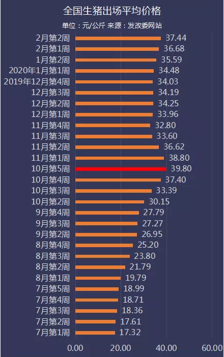 根据发改委网站信息,我们回顾一下2019年7月至今的生猪出厂价格:数据显示,2019年7月,我国平均生猪均价为18.20元/公斤、8月生猪均价为22.65元/公斤、9月生猪均价为27.34元/公斤、10月生猪均价为35.19元/公斤、11月生猪均价为35.46元/公斤、12月生猪均价为34.11元/公斤、2020年1月生猪均价为35.04元/公斤,具体数据如图: