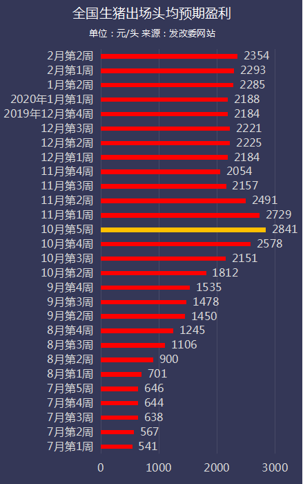 而从去年7月起,我国生猪出场头均预期盈利也在明显上涨,具体如下图: