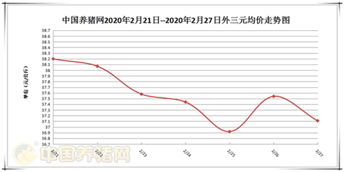 2020年2月27日,据中国养猪网猪价系统监测全国外三元均价为37.11元/公斤,价格较昨日下跌了0.43元/公斤。上周全国外三元均价为38.39元/公斤,今日较上周下跌了1.28元/公斤。内三元均价为36.15元/公斤,较昨日下跌了0.32元/公斤。土杂猪均价为35.53元/公斤,价格较昨日下跌了0.17元/公斤。