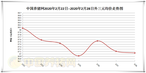 2020年2月28日,据中国养猪网猪价系统监测全国外三元均价为37.04元/公斤,价格较昨日下跌了0.07元/公斤。上周全国外三元均价为38.20元/公斤,今日较上周下跌了1.16元/公斤。内三元均价为36.10元/公斤,较昨日下跌了0.05元/公斤。土杂猪均价为35.48元/公斤,价格较昨日下跌了0.05元/公斤。