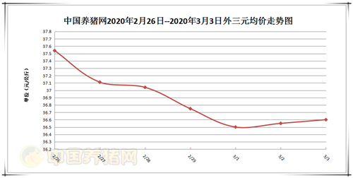 2020年3月3日,据中国养猪网猪价系统监测全国外三元均价为36.60元/公斤,价格较昨日上涨了0.05元/公斤。上周全国外三元均价为36.92元/公斤,今日较上周下跌了0.32元/公斤。内三元均价为35.62元/公斤,较昨日下跌了0.06元/公斤。土杂猪均价为35.29元/公斤,价格较昨日上涨了0.22元/公斤。