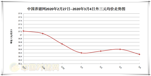 2020年3月4日,据中国养猪网猪价系统监测全国外三元均价为36.46元/公斤,价格较昨日下跌了0.14元/公斤。上周全国外三元均价为37.54元/公斤,今日较上周下跌了1.08元/公斤。内三元均价为35.76元/公斤,较昨日上涨了0.14元/公斤。土杂猪均价为35.13元/公斤,价格较昨日下跌了0.16元/公斤。