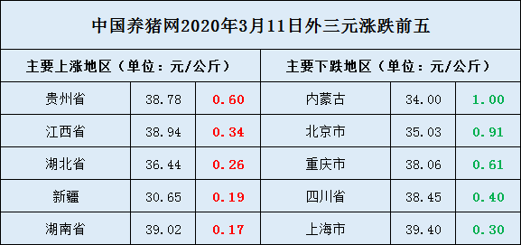 2020年3月11日,据中国养猪网猪价系统数据监测显示,今日我国外三元生猪价格走势继续微幅上涨,稳中趋强运行的态势不减。