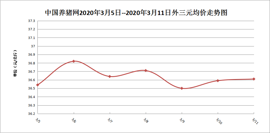 2020年3月11日,据中国养猪网猪价系统监测全国外三元均价为36.61元/公斤,价格较昨日上涨了0.02元/公斤。上周全国外三元均价为36.46元/公斤,今日较上周上涨了0.15元/公斤。内三元均价为35.81元/公斤,较昨日下跌了0.09元/公斤。土杂猪均价为35.43元/公斤,价格较昨日上涨了0.06元/公斤。