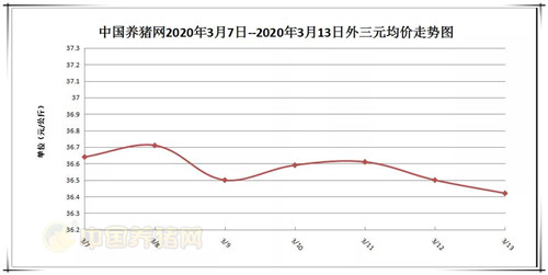2020年3月13日,据中国养猪网猪价系统监测全国外三元均价为36.42元/公斤,价格较昨日下跌了0.08元/公斤。上周全国外三元均价为36.82元/公斤,今日较上周下跌了0.40元/公斤。内三元均价为35.69元/公斤,较昨日下跌了0.11元/公斤。土杂猪均价为35.10元/公斤,价格较昨日下跌了0.15元/公斤。
