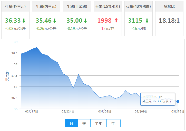 地区名称 | 外三元(元/公斤) | 内三元(元/公斤) | 土杂猪(元/公斤) | 玉米(元/吨) | 豆粕(元/吨) |