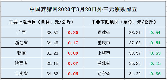 2020年3月20日,据中国养猪网猪价系统监测,全国外三元均价为36.17元/公斤,猪价较昨日下跌0.02元/公斤,较上周下跌0.25元/公斤。涨幅在0.01-0.20元/公斤之间,跌幅在0.03-0.54元/斤之间。
