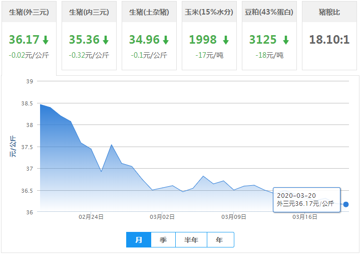 地区名称 | 外三元(元/公斤) | 内三元(元/公斤) | 土杂猪(元/公斤) | 玉米(元/吨) | 豆粕(元/吨) |