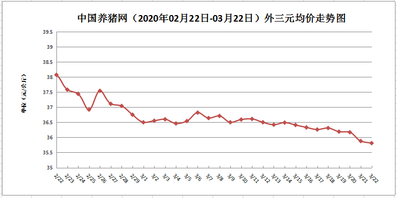 2020年3月22日(星期天),据中国养猪网猪价系统数据监测显示,今日我国外三元生猪价格为35.81元/公斤,较上月下跌2.26元/公斤,环比下跌5.93%;较去年同期上涨20.56元/公斤,同比上涨134.81%,长期来看,猪价波动较大。而近期猪价维持缓慢性下跌态势一月有足,但绝没有触底。