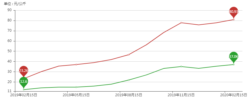 2020年2月12日,仔猪价格为81.01元/公斤,比去年同期上涨262.1%;