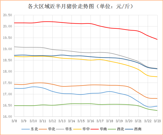 目前国内各大区域猪价差异化表现明显,东北地区猪价呈现反弹迹象,华南、华北、西南、华东、华中、西南地区猪价呈现下跌态势,北方部分地区猪价有反弹现象,南方地区猪价下跌幅度有所放缓,整体猪价跌势有所放缓。