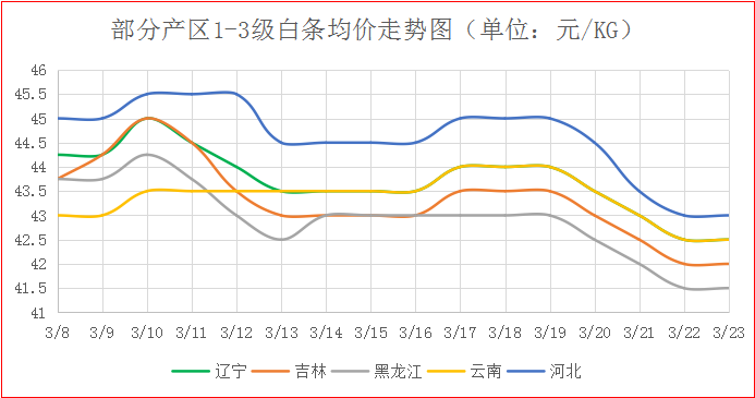 从辽宁、吉林、黑龙江、云南、河北等产区1-3级白条主流批发价格来看,辽宁、吉林、云南、黑龙江、河北地区白条价格呈现稳定态势,猪产品贸易商接货积极性表现一般。