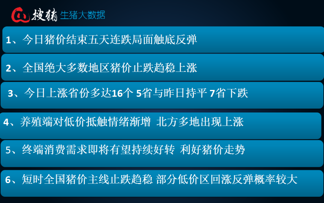 经过连续多日震荡回落后,目前前期积压的大部分大猪猪源基本消耗殆尽,养殖端对持续低价抵触情绪渐增,从昨日开始北方地区猪价跌势放缓率先企稳,今日北方多地一改多日连连下跌态势出现上涨,受北方企稳反弹带动,南方各地猪价也呈现一定的止跌回涨迹象。