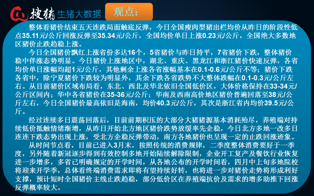 生猪市场绝大多数地区猪价止跌趋,全国瘦肉型生猪出栏均价至35.34元/公斤!