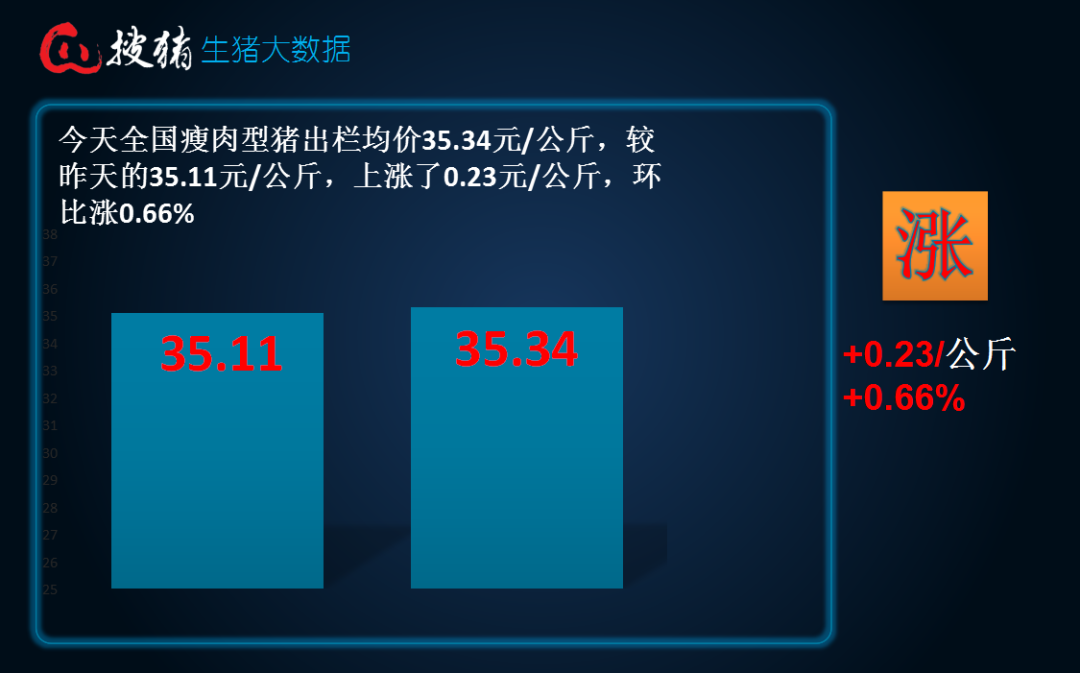 整体看猪价结束五天连跌局面触底反弹,今日全国瘦肉型猪出栏均价从昨日的阶段性低点35.11元/公斤回涨反弹至35.34元/公斤,全国均价单日上涨0.23元/公斤,全国绝大多数地区猪价止跌趋稳上涨。