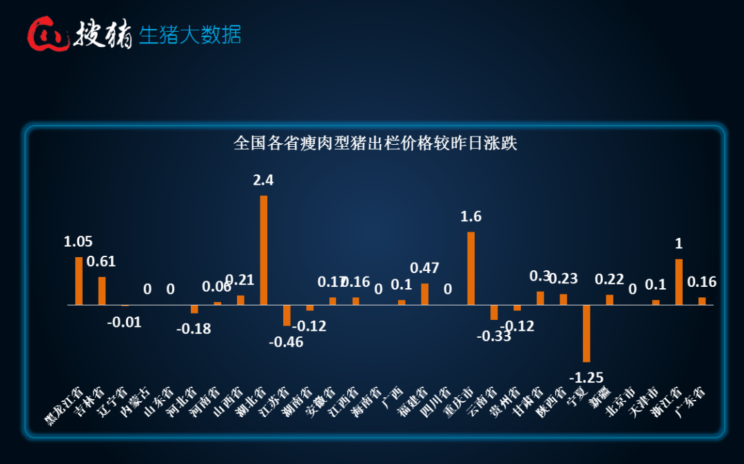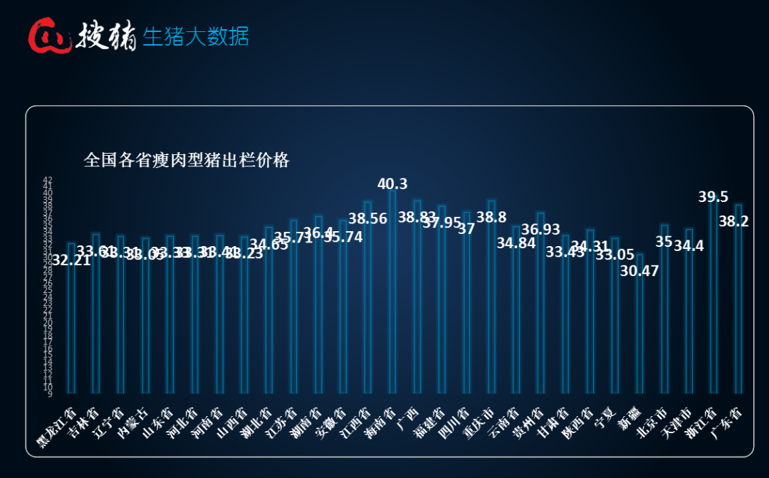 今日全国猪价飘红上涨省份多达16个,5省猪价与昨日持平,7省猪价下跌,整体猪价稳中伴涨态势明显。今日猪价上涨地区中,湖北、重庆、黑龙江和浙江猪价快速反弹,各省均价单日涨幅均超1元/公斤,其他剩余上涨各省涨幅基本在0.1-0.6元/公斤不等;猪价下跌各省中,除宁夏猪价下跌较为明显外,其余下跌各省跌势不大整体跌幅在0.1-0.3元/公斤左右。从目前猪价区域布局看,东北、西北及华北依旧全国低价区,大体价格保持在33-34元/公斤区间内;华中各省猪价在35-36元/公斤;华南及西南高价地区猪价普遍回落至38元/公斤左右,今日全国猪价最高依旧是海南,均价40.3元/公斤,其次是浙江省内均价39.5元/公斤。