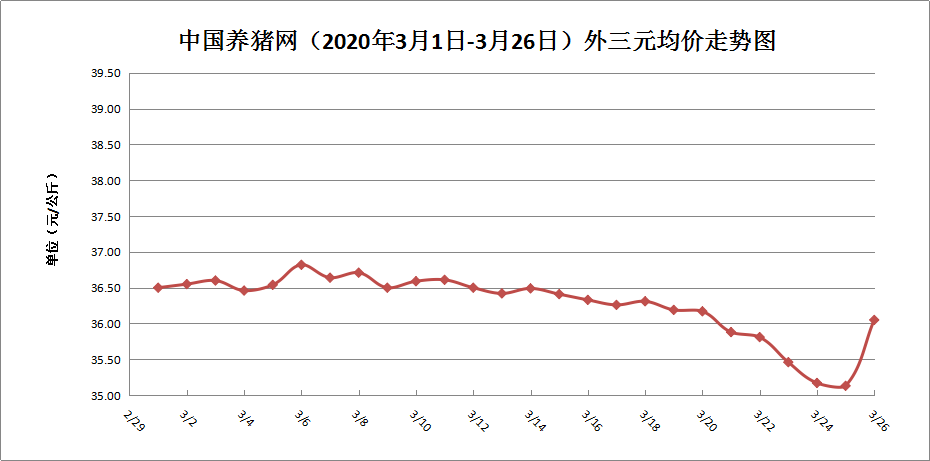 2020年3月26日(星期四),据据中国养猪网猪价系统数据监测显示,今日我国活猪价格为35.06元/公斤,价格较昨日下跌0.07元/公斤,较上周下跌1.13元/公斤,较上月下跌2.48元/公斤,环比下跌7.07%;较去年同期上涨19.87,同比上涨130.81%。