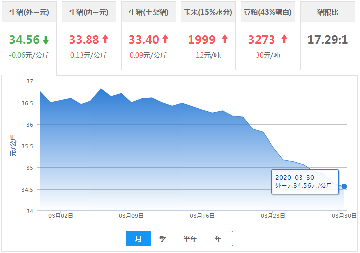 2020年3月30日(星期一),据中国养猪网猪价系统数据监测显示,今日我国外三元生猪价格为34.56元/公斤,价格较昨日下跌0.06元/公斤,较上周下跌0.90元/公斤,较上月下跌2.19元/公斤,环比下跌6.33%。