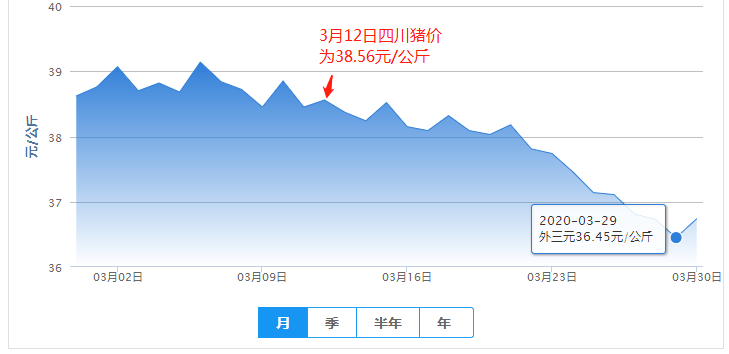 2020年3月12日,四川省猪价为38.56元/公斤、3月13日猪价为38.37元/公斤、3月29日,猪价为36.45元/公斤,累计跌幅为2.11元/公斤。