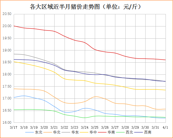 目前国内各大区域猪价差异化表现明显,华北地区猪价呈现稳定态势,东北、西南、华中、西北、华南、华东、西南地区猪价呈现微跌态势,猪价下跌现象与下跌幅度明显有所减少。