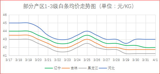 从辽宁、吉林、黑龙江、河北等产区1-3级白条主流批发价格来看,吉林、黑龙江、河北、辽宁地区白条价格呈现稳定态势,贸易商接货积极性表现一般。