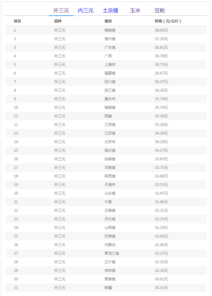 今日猪价最高地区为海南省38.00元/公斤,最低地区为新疆维吾尔自治区30.31元/公斤。排名前五的地区有:海南省、贵州省、广东省、广西壮族自治区、上海市,今日浙江省猪价出现暴跌,直接掉落全国前五,而贵州省猪价今日上涨明显,0.98元/公斤的上涨幅度一跃成为我国猪价第二。