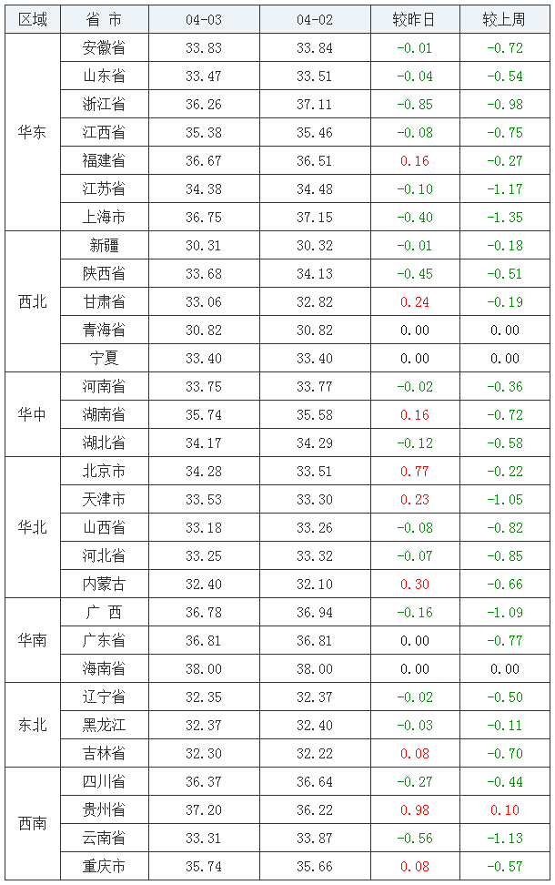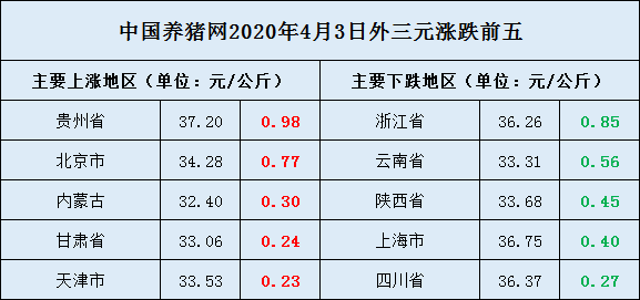 2020年4月3日(星期五),据猪价系统数据监测,全国生猪均价(外三元)为34.23元/公斤,较昨日下跌0.09元/公斤;内三元生猪均价为33.63元/公斤,价格较昨日下跌0.09元/公斤;土杂猪生猪均价为33.07元/公斤,较昨日下跌0.19元/公斤。