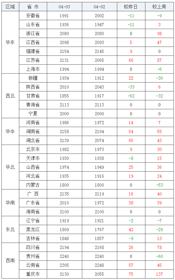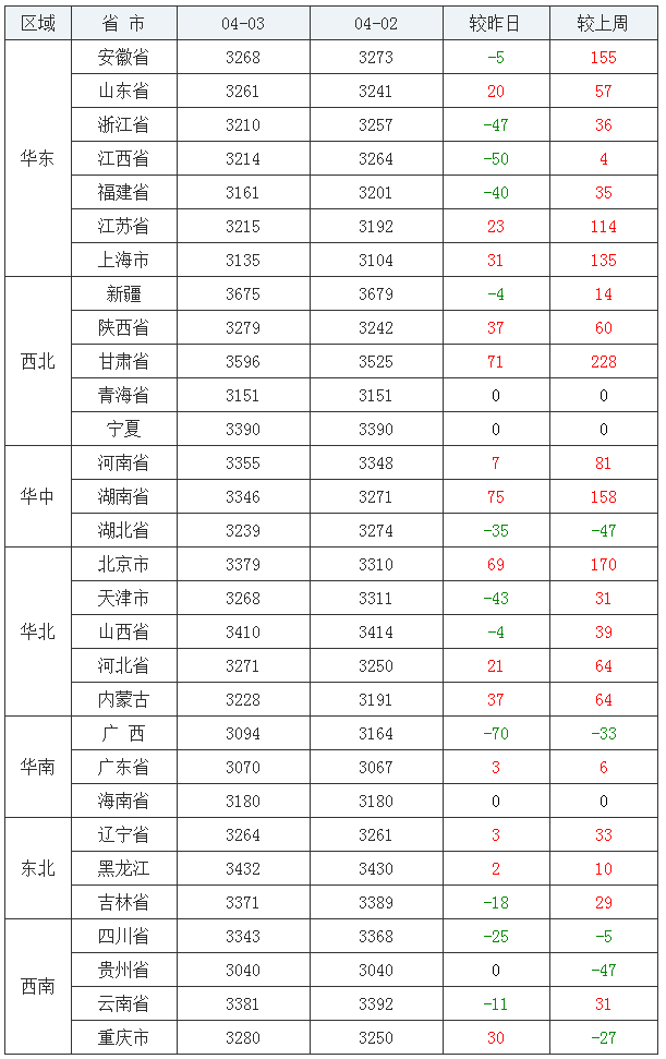 豆粕价格前五为:新疆维吾尔自治区3675元/吨、甘肃省3596元/吨、黑龙江省3432元/吨、山西省3410元/吨、宁夏回族自治区3390元/吨;