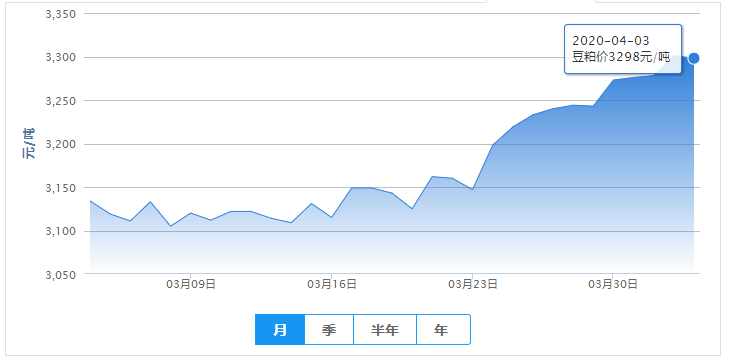 2020年4月3日,今日全国豆粕均价为3298元/吨,较昨日下跌3元/吨。
