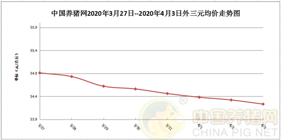 2020年4月3日,据中国养猪网猪价系统监测全国外三元均价为34.23元/公斤,价格较昨日下跌0.09元/公斤。上周全国外三元均价为34.91元/公斤,今日较上周下跌了0.68元/公斤。内三元均价为33.63元/公斤,较昨日下跌0.09元/公斤。土杂猪均价为33.07元/公斤,价格较昨日下跌0.19元/公斤。