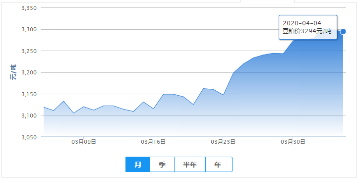 2020年4月4日,今日全国豆粕均价为3294元/吨,较昨日下跌4元/吨。